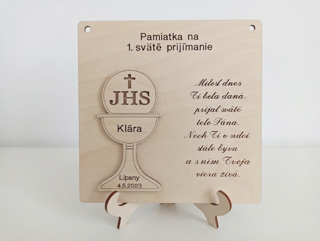 Tabuľka je vyrobená z brezovej preglejky slúži ako milá pripomienka prijatia tejto sviatosti